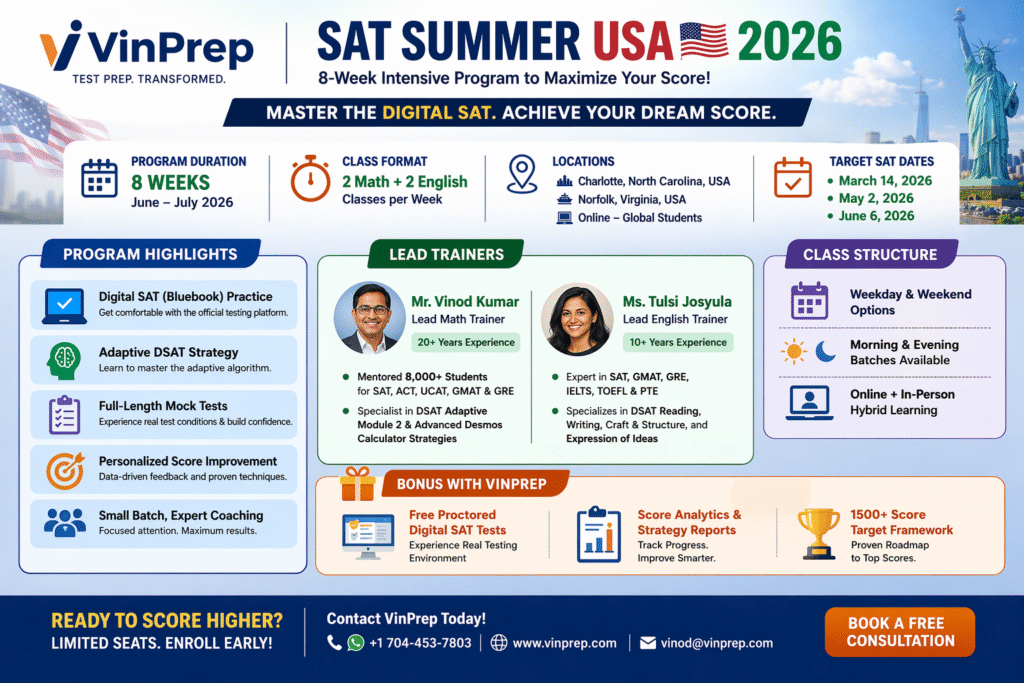 Top-Rated Online SAT Prep 2026 for North Carolina, Georgia, Virginia, Texas, and California Students Maximize your summer break and secure your college future. VinPrep’s 8-Week Digital SAT Summer Course is a high-impact, fully virtual program specifically engineered for high-achieving students across the USA. Whether you are aiming for UNC Chapel Hill, Georgia Tech, UVA, UT Austin, or the UC System, our online curriculum provides the competitive edge needed for a 1500+ score.