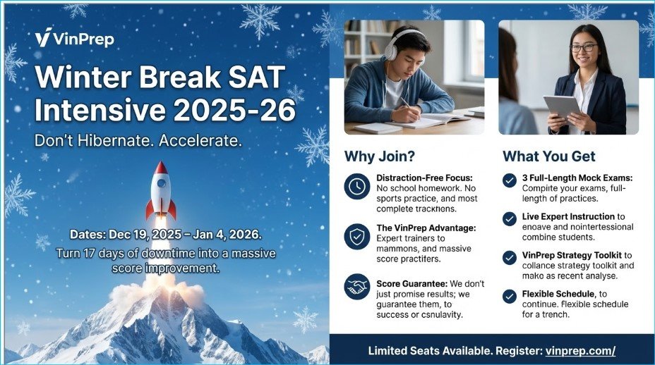 The VinPrep Winter Break SAT Course (Dec 19, 2025 – Jan 4, 2026) is not a generic review. It is a targeted, high-intensity curriculum built specifically for the Digital SAT. We focus on the exact skills tested by the College Board, prioritizing high-yield topics that offer the fastest score improvements.